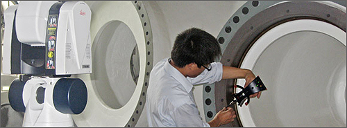 對于完成諸如風車葉片、塔筒、塔架等超大尺寸的測量,要求測量系統能夠具備獲取三維坐標的能力、測量空間要大 (如:40 m x 10 m x 5 m)、測量精度高、能夠密集采點以完成對曲面的評價、能夠便攜使用在各種場所、實現與CAD模型的比較分析、同時精確的對測量結果進行記錄。一般來說,可以用以下系統完成大尺寸物體的精確工業測量: